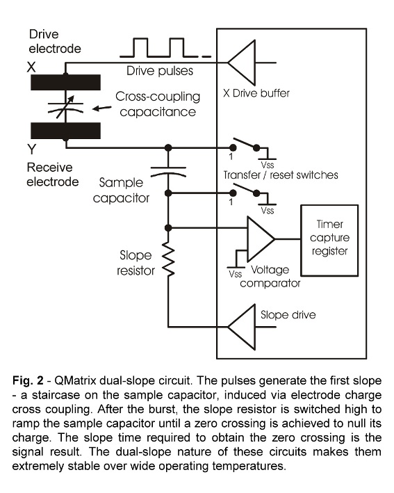 利用多條 X 驅動和 Y 接收線並將按鍵電極設置到交叉點上構成的多鍵矩陣,鍵盤按鍵會如機電鍵盤般按時順序掃描。QMatrix 電極可以感測任何介電材料,如厚度高達 50mm 的玻璃或塑料,取決於電極的大小和脈衝串長度 (增益) 的設置。