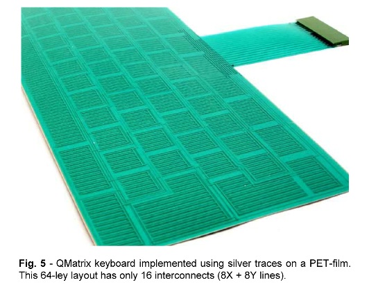 圖5: 利用 PET 薄膜上的銀線來實現的 QMatrix 鍵盤,這個 64 鍵布局隻需要 16 個互聯 (8X + 8Y線)。