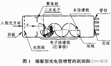 光電倍增管是一種真空器件。它由光電發射陰極(光陰極)和聚焦電極、電子倍增極及電子收集極(陽極)等組成。典型的光電倍增管按入射光接收方式可分為端窗式和側窗式兩種類型。圖1所示為端窗型光電倍增管的剖麵結構圖。其主要工作過程如下: