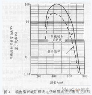 光電倍增管由陰極收入射光子的能量並將其轉換為光子,其轉換效率(陰極靈敏度)隨入射光的波長而變。這種光陰極靈敏度與入射光波長之間的關係叫做光譜響應特性。圖4給出了雙堿光電倍增管(其光陰極材料為Sb-Rb-Cs和Sb-K-Cs)的典型光譜響應曲線。
