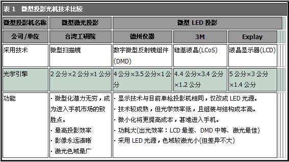 由於便攜式裝置內建微型投影機風潮興起,市場對於微型投影機的尺寸要求更加嚴苛。有業內人士表示,相比發光二極管(LED)光源微型投影技術(表1),激光微型投影具有無限焦距、光機體積小、色彩飽和度高、低耗能等特性,後勢深具潛力。