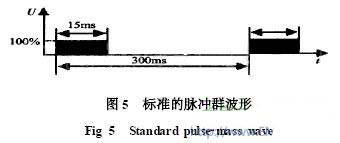 電磁兼容設計靠電磁兼容試驗來驗證與改進。現在,有了比較完善的電磁兼容試驗方法和專門的試驗設備。開關電器動作時,形成強烈的幹擾,產生瞬態脈衝。IEC61000-4-4標準對電快速瞬變脈衝幹擾作出規定,分為單個脈衝、一群脈衝、脈衝群。脈衝群波形如圖5所示,周期為300ms,脈衝束寬度為15ms。