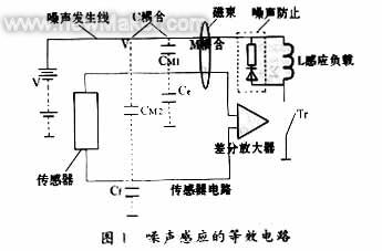 外部噪聲是由傳感器電路外的人為或自然幹擾造成的。主要原因就是電磁輻射。其噪聲源十分廣泛,幾乎包括所有的電氣、電力機械,還有雷電、大氣電離等自然現象,同時,係統中的模數部分有公共接地、公共電源時,數字信號的頻繁電流變化在模擬電路中產生噪聲,它們通過靜電耦合、電磁耦合和漏電電流等形式存在於傳感器的電路中,如圖1所示。