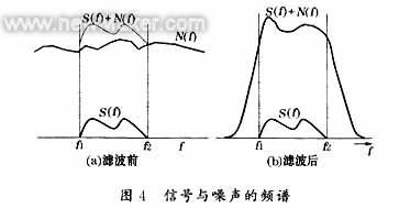 濾波電路的作用主要是對輸入信號進行處理,通常是希望濾出噪聲。濾波器種類很多,從大的方向可分為經典濾波器與現代濾波器兩大類。經典濾波器可濾出與有用信號占用不同頻帶的噪聲,但對有用信號與噪聲的頻譜相互重疊的情況卻無能為力。圖4所示是信號與噪聲的頻譜,圖4中,S(f)為有用信號,頻帶為f1~f2,N(f)為噪聲,經濾波後隻能濾出f1~f2以外的噪聲,噪聲與信號重疊部分無法濾出。