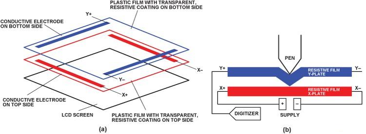 圖 1. (a) 阻性觸摸屏的結構;(b) 用戶觸摸屏幕時的電氣接觸