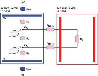 雖sui然ran如ru此ci,但dan通tong過guo理li解jie並bing模mo擬ni該gai過guo程cheng背bei後hou的de物wu理li原yuan理li,我wo們men可ke以yi從cong阻zu性xing觸chu摸mo屏ping提ti取qu更geng多duo信xin息xi。當dang發fa生sheng兩liang點dian觸chu摸mo時shi,無wu源yuan屏ping幕mu中zhong的de一yi段duan電dian阻zu加jia上shang觸chu點dian的de電dian阻zu與yu有you源yuan屏ping幕mu的de導dao電dian段duan並bing聯lian,因yin此ci電dian源yuan的de負fu載zai阻zu抗kang減jian小xiao,電dian流liu增zeng大da。阻zu性xing控kong製zhi器qi的de經jing典dian方fang法fa是shi假jia設she有you源yuan層ceng中zhong的de電dian流liu恒heng定ding不bu變bian,無wu源yuan層ceng為wei等deng電dian位wei。兩liang點dian觸chu摸mo時shi,這zhe些xie假jia設she不bu再zai成cheng立li,為wei了le提ti取qu所suo需xu的de信xin息xi,需xu要yao進jin行xing更geng多duo測ce量liang。