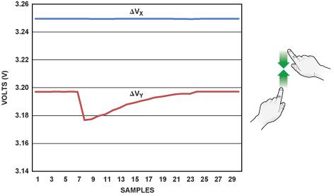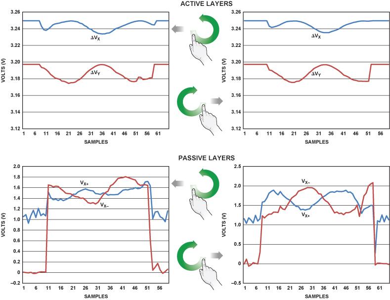 在後半周期中,將一個直流電壓施加於下層(有源層),並測量Y+引腳的電壓(對應於VX+ – VX–),以提供與X方向上的運動(接近還是分開)相關的信息。