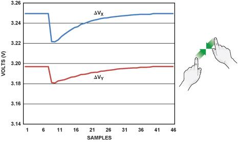 圖 3 顯示了一個沿著垂直(Y)軸zhou捏nie合he的de例li子zi。當dang手shou勢shi開kai始shi時shi,其qi中zhong一yi層ceng的de兩liang根gen電dian極ji之zhi間jian的de電dian壓ya恒heng定ding不bu變bian,另ling一yi層ceng則ze表biao現xian出chu階jie躍yue性xing降jiang低di,然ran後hou隨sui著zhe手shou指zhi相xiang互hu靠kao近jin而er提ti高gao。