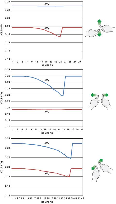 圖 9 中的電路可以測量所有需要的電壓來實現全部性能,包括:a)單點觸摸位置;b)縮放、捏合、旋轉手勢檢測和量化; c)區別順時針與逆時針旋轉。用兩點觸摸手勢來完成單點觸摸操作時,可以估計手勢的中心位置。