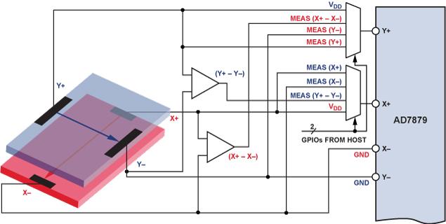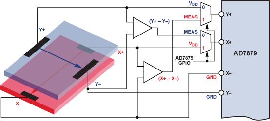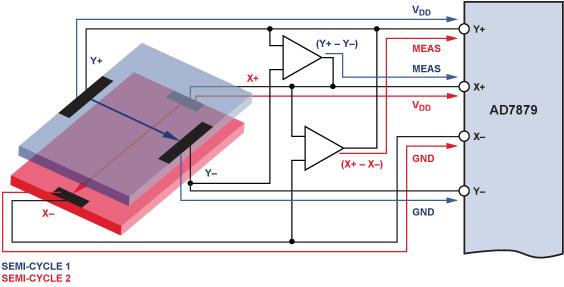 半周期 1:電壓施加於Y層,同時測量(VY+ – VY–)、VX–和 VX+。每完成一個測量,AD7879 就會產生一個中斷,以便處理器改變GPIO配置。