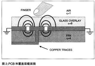 當把手指放在邊緣電場的附近時,電容式傳感係統的導電表麵積會增加。由手指所產生的額外電荷存儲容量,就是我們所知的手指電容CF。在本文中,無手指觸摸時的傳感器電容用CP來表示,意指寄生電容。