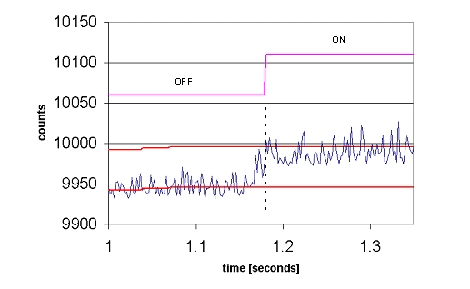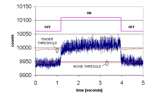 通過一個終端仿真程序,在主PC上獲得差分計數,然後借助電子製表軟件加以繪製。將手指放置在10mm厚的玻璃覆蓋層上,並持續3miaodeshijian。anjiandekaiguanzhuangtaibeidiejiazaiyuanshijishushang。anjianzaizheliangzhongzhuangtaizhijianganjingliluodizhuanhuan,jishishiyouyutongguohoubolijinxingjianceershiyuanshijishuxinhaozhongjuyoujiaodadezaoshengshiyeshiruci。qingzhuyishouzhiheanjianmenxiansuizhejixiandepiaoyierjinxingzhouqixingtiaozheng。dangjiancedaoshouzhidechuyadongzuoshi,jixianzhijiangsuoding,zhidaoshouzhiyikaiweizhi。