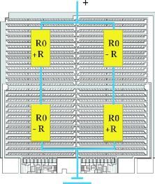 現代傳感器係統主要由兩個元件組成 —基本傳感器和信號處理專用集成電路 (ASIC)(圖 1)。現已證明,後來由 Lord Klevin 於 1857 年(nian)發(fa)現(xian)的(de)各(ge)向(xiang)異(yi)性(xing)磁(ci)阻(zu)效(xiao)應(ying)特(te)別(bie)適(shi)用(yong)於(yu)檢(jian)測(ce)磁(ci)場(chang)。首(shou)先(xian)考(kao)慮(lv)通(tong)常(chang)具(ju)有(you)多(duo)種(zhong)磁(ci)疇(chou)結(jie)構(gou)的(de)鐵(tie)磁(ci)性(xing)材(cai)料(liao)。這(zhe)些(xie)稱(cheng)之(zhi)為(wei)韋(wei)斯(si)磁(ci)疇(chou)的(de)結(jie)構(gou),其(qi)內(nei)部(bu)磁(ci)化(hua)的(de)方(fang)向(xiang)彼(bi)此(ci)不(bu)同(tong)。如(ru)果(guo)將(jiang)這(zhe)種(zhong)材(cai)料(liao)平(ping)鋪(pu)為(wei)一(yi)薄(bo)層(ceng),那(na)麼(me)磁(ci)化(hua)矢(shi)量(liang)處(chu)於(yu)材(cai)料(liao)層(ceng)平(ping)麵(mian)方(fang)向(xiang)。另(ling)外(wai),可(ke)較(jiao)精(jing)確(que)地(di)假(jia)設(she)隻(zhi)存(cun)在(zai)一(yi)個(ge)磁(ci)疇(chou)。當(dang)這(zhe)種(zhong)元(yuan)件(jian)暴(bao)露(lu)於(yu)外(wai)部(bu)磁(ci)場(chang)中(zhong)時(shi),後(hou)者(zhe)會(hui)改(gai)變(bian)內(nei)部(bu)磁(ci)化(hua)矢(shi)量(liang)的(de)方(fang)向(xiang)。如(ru)果(guo)同(tong)時(shi)一(yi)股(gu)電(dian)流(liu)通(tong)過(guo)該(gai)元(yuan)件(jian),就(jiu)會(hui)產(chan)生(sheng)電(dian)阻(zu)(圖 2),這(zhe)取(qu)決(jue)於(yu)電(dian)流(liu)和(he)磁(ci)化(hua)之(zhi)間(jian)的(de)角(jiao)度(du)。當(dang)電(dian)流(liu)和(he)磁(ci)化(hua)方(fang)向(xiang)彼(bi)此(ci)成(cheng)直(zhi)角(jiao)時(shi),電(dian)阻(zu)最(zui)小(xiao),當(dang)二(er)者(zhe)平(ping)行(xing)時(shi),電(dian)阻(zu)最(zui)大(da)。電(dian)阻(zu)變(bian)化(hua)的(de)大(da)小(xiao)取(qu)決(jue)於(yu)材(cai)料(liao)。鐵(tie)磁(ci)性(xing)材(cai)料(liao)的(de)性(xing)質(zhi)也(ye)決(jue)定(ding)對(dui)溫(wen)度(du)的(de)依(yi)賴(lai)性(xing)。電(dian)阻(zu)最(zui)大(da)變(bian)化(hua)為(wei) 2.2% 並且對溫度變化反應良好的最佳合金是 81% 的鎳和 19% 的鐵組成的合金。恩智浦所有傳感器係統中的基本傳感器都采用這種強磁鐵鎳合金。在惠斯登電橋電路中單獨配置幾個 AMR 電阻,以增強輸出信號並改善溫度反應特性。此電路也可在製造過程中進行微調。圖 3 顯示如何在裸片上配置 AMR 元件。