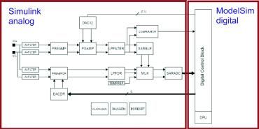 確定磁場之後是傳感器係統仿真。AMR 元yuan件jian的de電dian阻zu變bian化hua是shi各ge向xiang異yi性xing磁ci阻zu效xiao應ying的de直zhi接jie結jie果guo。這zhe樣yang,磁ci場chang仿fang真zhen的de結jie果guo會hui導dao致zhi代dai表biao信xin號hao處chu理li中zhong輸shu入ru信xin號hao的de電dian阻zu發fa生sheng變bian化hua。對dui模mo擬ni前qian端duan進jin行xing建jian模mo可ke采cai用yong Simulink。這種行為模型是概念設計的產物,標誌著產品開發的起點。每個 Simulink 塊對應一個模擬信號處理組件,例如放大器或過濾器。但是,尚未考慮模擬組件的控製部分,這由數字係統實現。HDL 設計則仿真通過數字方法實現的功能,而且在完成產品開發之後就會最終成形。因此,整體係統仿真是 Simulink 對模擬組件的行為模型以及 ModelSim 對 HDL 設計的共同仿真(圖8)。可通過仿真從概念階段順利過渡到 HDL 設計及後續階段。在共同仿真中,可用 ModelSim 中部署的 Verilog 代碼逐漸代替 Simulink 參考模型,從而可逐項驗證 HDL 設計。可持續進行此過程,直到在 Verilog 中實現整個數字部件,而模擬係統部件仍保持為 Simulink 模型。此工具組合也已證明對 IC 評估同樣有用。自始至終使用這種工具可以更容易理解 IC 行為,並可創建用來分析和解釋任何錯誤的框架。這些工具的主要好處在於,能夠更快速、更準確地答複客戶的查詢,以及更好地了解與環境條件相關的傳感器功能。