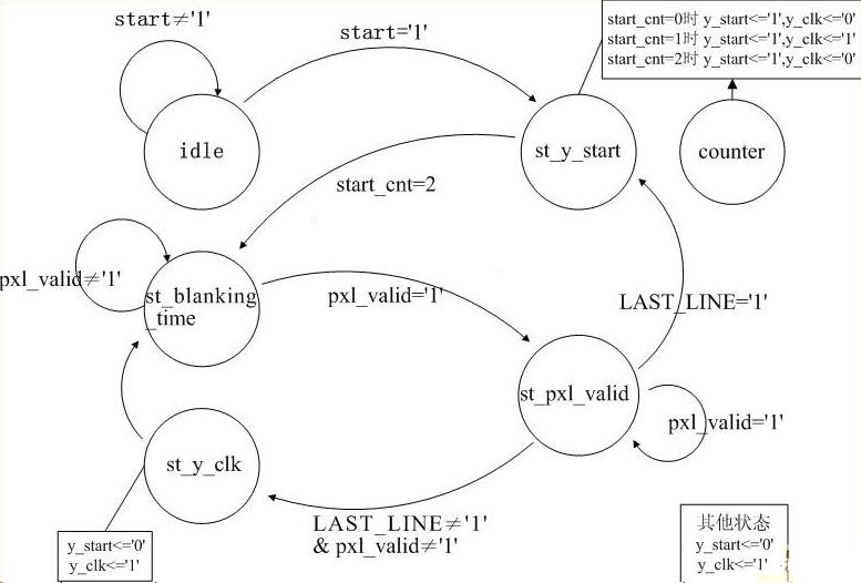 CMOS圖像傳感器結構簡單,內部集成度高,因此僅需很少的外部控製信號即可完成視頻圖像的采集輸出。係統工作過程如下:當係統上電後,CPLD產生複位信號複位整個芯片到初始狀態,然後對芯片進行並行數據注入,向CMOS圖像傳感器的特殊寄存器寫入預定值,設置諸如像元積分時間,像素讀出行數,輸出放大器增益等參數。隨後CPLD給CMOS芯片提供 ss_start信號,標誌開始像素積分,ss_stop信號結束像素積分,隨後圖像傳感器即處於可讀出狀態。向CMOS發出y_start信號開始一幀圖像的讀出,發出y_clock信號,開始一行圖像的讀出,當CMOS圖像傳感器有像素信號輸出時, pxl_valid引腳信號為高,此時CMOS圖像傳感器正在進行一行圖像的輸出,當pxl_valid變低時,一行圖像輸出結束,CPLD再提供下一個y_clock信號,啟動CMOS進行下一行圖像的讀出。當一幀圖像的最後一行開始讀出時,CMOS芯片的LAST_LINE引腳變高,標誌一幀圖像讀出的結束,CPLD再產生下一個ss_start信號,開始下一幀圖像的讀出。這樣,CMOS就在CPLD的時序控製下,正常工作,循環讀出圖像。