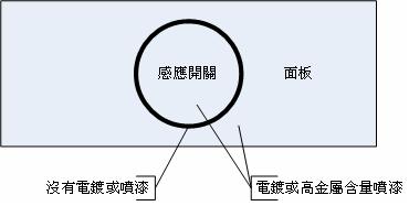 d.同樣的,感應電極與手指之間不能有金屬層夾在中間,所以麵板上不可以有金屬電鍍及含金屬超過15%的噴漆等會形成導電層的設計。