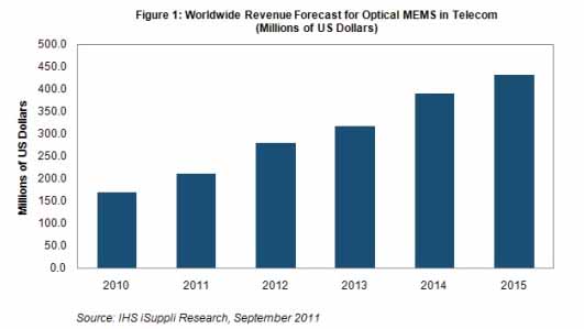 據IHS公司的最新MEMS市場研究報告,由於市場對寬帶互聯網服務的需求持續激增,預計2011年以及隨後幾年光MEMS銷售額強勁增長。光MEMS是超高速光纖網絡中的關鍵部件。