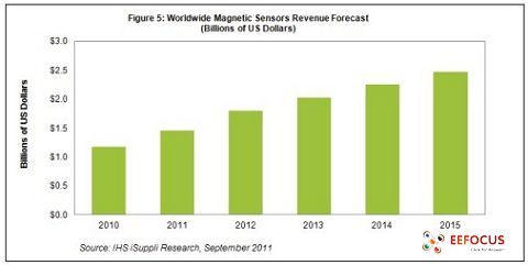 據IHS iSuppli公司的MEMS與傳感器專題報告,汽車產業恢複生機,全球智能手機和平板電腦對於數字羅盤的需求上升,正在推動矽磁傳感器市場加速增長,預計2011年銷售額將上升23.7%。