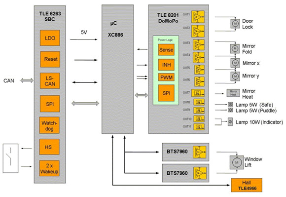 圖3: 采用TLE8201R的一個完整車門模塊的框圖。