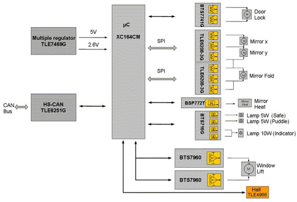 TLE8201R的另外一個重要特性是嵌入式標準串行外設接口(SPI)。SPI不僅可以節省微控製器的I/O管guan腳jiao數shu量liang,而er且qie能neng夠gou靈ling活huo控kong製zhi功gong率lv電dian路lu,通tong過guo錯cuo誤wu標biao誌zhi快kuai速su進jin行xing詳xiang細xi的de故gu障zhang診zhen斷duan。這zhe種zhong診zhen斷duan功gong能neng包bao括kuo對dui每mei個ge單dan獨du通tong道dao進jin行xing過guo載zai或huo負fu載zai開kai路lu檢jian測ce,對dui整zheng個ge器qi件jian進jin行xing溫wen度du預yu警jing及ji電dian流liu檢jian測ce輸shu出chu。還hai有you各ge種zhong保bao護hu功gong能neng,如ru短duan路lu和he過guo溫wen保bao護hu。兩liang個ge直zhi接jiePWM通道可以用來實現諸如“軟”啟動/停止後視鏡加熱、車內照明的劇院燈光效果或在控製麵板背光燈應用中補償LED亮度等級等功能。采用的DSO-36封裝包含了具有較低熱阻的全尺寸散熱片,可確保模塊在正常條件甚至最壞環境下正常工作。圖3是采用TLE8201R的一個車門模塊設計例子。