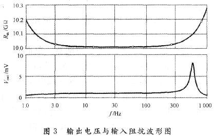 如圖3所示,圖中上半部分為係統輸出信號波形,下半部分為係統輸入阻抗波形,從圖中可以看出,在頻率為100 Hz處,測量係統的輸出電壓值Vout為10.011 mV,交流輸入阻抗Rin為1.132 8 GΩ。經計算,係統的放大倍數A為100.998倍。