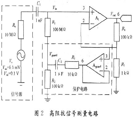 圖2中下側虛線框內的電路為保護電路,從放大器A1的反相輸入端引入信號到保護放大器Aguard的正相輸入端,保護放大器實則為電壓跟隨器。電阻R1的低電位端加上保護電位Vguard,當R2>>R3時。在一定頻率範圍內,保護電位近似等於高阻抗輸入端電位Vin,可以通過調節R2,R3的阻值來改變保護電位的大小。保護電位由保護緩衝放大器提供,而不是由信號源提供.電阻R1的低阻抗端加上保護電位後,其電壓降將大大減小,流經它的電流也將大大減小。