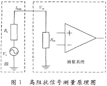 高阻抗信號測量,易受到測量係統輸入阻抗的分壓與係統輸入偏置電流的影響。如圖1所示,將被測高阻抗信號源與測量係統相連,信號源的戴維寧等效電路由Vs與Rs串聯而成。假定測量係統的等效輸入電阻為Rin,輸入端電壓為Vin,由於Rs與Rin的分壓,使得輸入端電壓減小,測量係統的輸人端電壓為: