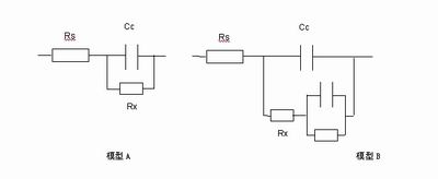 在模型A中電阻器Rs表示金屬所在的溶液,而電容Ccbiaoshijinshubiaomiandebaohutucenghuotuliao,zhebiaoshichushitucengdedianrong。jingguoyiduanshijianhou,shuishenrutucengzhongxingchengxindeyetihejinshujiemian。suizhejinshudefushi,tongguorongyeyujinshuzhijiandebaohutucengxingchenglizidaodianlujing。zhekeyiyongRx與Cc並聯模型來表示。另外,有些模型(模型B)還有一個附加的R和C並聯起來再與Rx串聯的電路來表示金屬保護塗層隨著時間變化的分層模型。