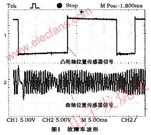 通過圖4還能看出曲軸位置傳感器波形出現2次才與凸輪軸位置傳感器波形重合一次起始位置,這種關係和本車曲軸轉速與凸輪軸轉速比為2:1的關係一致,也正好是1缸上止點的位置,也就是1缸點火正時的基準位置,也決定了其它3個缸的點火時刻。此信號傳輸給腳,ECU就能發出點火信號,起動發動機。否則ECU就不發出點火信號,發動機不能起動。