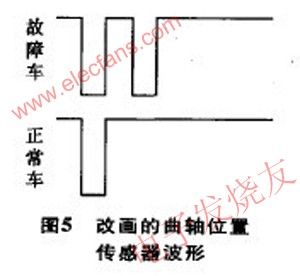 有無波形可得出圖5中的2個波形,ECU隻有得到圖5下圖波形才能發出點火信號起動發動機,而ECU得到圖5上的波形不能發出點火信號起動發動機,但在偶然的時刻故障位置產生的波形恰好達到合格的底線時,就可以起動發動機。起動後,ECU對曲軸位置傳感器波形的檢測就不是那麼嚴了,因此,發動機起動後不會熄火。也就是此車故障的根本原因。