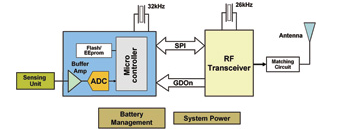 meigewuxianchuanganqidoubeikanzuoyigejiedian,yongyouwuxiantongxinnengli,tongshihaijuyouyidingdexinhaochuliyuwangluoshujudezhineng。genjuyingyongdeleixing,meigejiediandoukeyiyouyigezhidingdedizhi。tu2顯示了某個節點的通用結構圖。它一般會包括一個傳感裝置、一個數據處理微控製器,以及一個無線連接RF模塊。根據不同的網絡定義,RF模塊可以起到一個簡單發射器或者收發器 (TX/RX)的作用。進行節點設計時,注意電流消耗和處理能力非常的重要。微控製器的內存非常依賴於所使用的軟件棧。