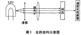 係(xi)統(tong)要(yao)求(qiu)光(guang)電(dian)傳(chuan)感(gan)探(tan)測(ce)部(bu)分(fen)具(ju)有(you)較(jiao)高(gao)的(de)檢(jian)測(ce)精(jing)度(du)和(he)穩(wen)定(ding)性(xing),且(qie)實(shi)時(shi)性(xing)高(gao),即(ji)需(xu)要(yao)對(dui)待(dai)測(ce)海(hai)水(shui)進(jin)行(xing)連(lian)續(xu)不(bu)間(jian)斷(duan)的(de)在(zai)線(xian)測(ce)量(liang),因(yin)此(ci)采(cai)用(yong)近(jin)紅(hong)外(wai)LED作(zuo)為(wei)光(guang)源(yuan)。光(guang)源(yuan)發(fa)出(chu)的(de)近(jin)紅(hong)外(wai)光(guang)經(jing)過(guo)光(guang)學(xue)鏡(jing)組(zu)選(xuan)擇(ze)得(de)到(dao)對(dui)溢(yi)油(you)具(ju)有(you)特(te)征(zheng)吸(xi)收(shou)的(de)分(fen)析(xi)光(guang),經(jing)透(tou)射(she)與(yu)樣(yang)品(pin)室(shi)的(de)樣(yang)品(pin)發(fa)生(sheng)相(xiang)互(hu)作(zuo)用(yong),然(ran)後(hou)進(jin)入(ru)光(guang)電(dian)探(tan)測(ce)器(qi),將(jiang)光(guang)信(xin)號(hao)轉(zhuan)換(huan)為(wei)電(dian)信(xin)號(hao),從(cong)而(er)實(shi)現(xian)對(dui)樣(yang)品(pin)成(cheng)分(fen)的(de)檢(jian)測(ce)見(jian)圖(tu)1所示。
