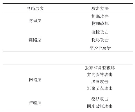 無線傳感器網絡(WSN)易受各種安全威脅,許多文獻勻有描述。文獻將WSN的攻擊按照不同層次分類,如表1所示。
