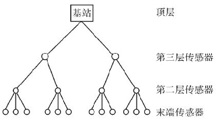 該網絡體係結構有4層ceng。最zui底di層ceng由you所suo有you的de末mo端duan傳chuan感gan器qi組zu成cheng,這zhe些xie末mo端duan傳chuan感gan器qi從cong周zhou圍wei環huan境jing中zhong收shou集ji數shu據ju。第di二er層ceng和he第di三san層ceng由you監jian控kong節jie點dian組zu成cheng,第di二er層ceng傳chuan感gan器qi監jian控kong末mo端duan傳chuan感gan器qi的de通tong信xin模mo式shi;第三層傳感器監控第二層傳感器的行為。第三層傳感器布置時要求:每個第三層傳感器能夠監控2個第二層傳感器間的通信。最後,頂層傳感器就是基站,通常人工操作。