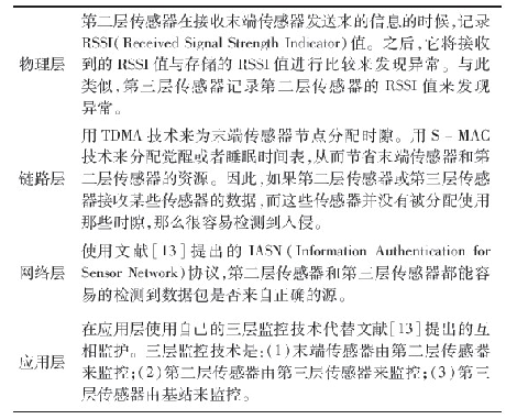修改了Da Silva等人提出的入侵檢測算法,並將它運用在第二和第三層傳感器上。由於傳感器資源有限,沒有在任何末端傳感器上運用IDS.監控節點的功能被分成三個階段。第一階段:所有的末端傳感器從它們周圍環境收集數據,然後報告給第二層傳感器。第二階段:用基於分層的攻擊檢測方法來檢測文獻提出的攻擊類型。表2描述了攻擊在各層中如何被發現的。這種基於分層的攻擊檢測方法使得係統更完善。第三階段:比較每個上報的結果來定義閾值,以此來決定是否要發出一個報警。第三階段常常可以減少錯報率。閾值可以人工定義或者根據特定的WSN需求來調整。因此,提出的入侵檢測體係結構通過減少錯報能夠檢測到大多數的安全威脅。