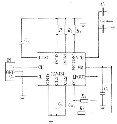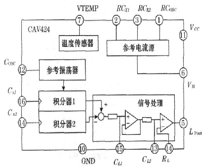 CAV424是專門用於電容檢測轉換的集成芯片, 其工作原理圖及外圍連接圖如圖1所示。