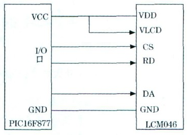 控製顯示電路以單片機為核心, 選用PIC16F877單片機為控製器, 其內部含有10位高精度A /D轉化器, 能夠直接處理模擬電壓, 調整CAV424的GLP , 可以使輸出電壓範圍在2 5~ 35V 之間, 滿足單片處理信號的要求。顯示器件選用LCM 046液晶模塊, 其功耗低, 工作電流隻有μA級, 並且其與處理器連接簡單。連接圖如圖4所示。