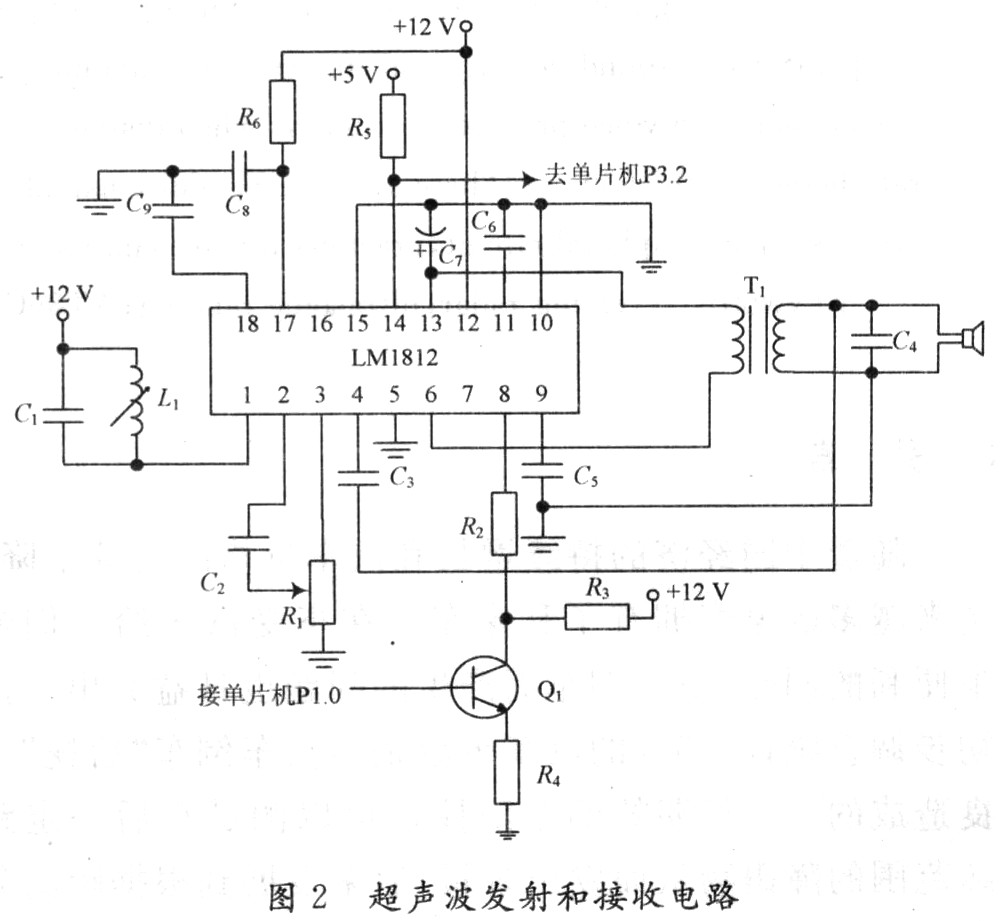 超聲波發射和接收電路如圖2所示。當LM1812的8腳為高電平時,LM1812處於發射模式;當8腳為低電平時,LM1812處於接收模式。值得注意的是,單片機到LM1812的連接要進行5~12 V的電平轉換。當LM1812處於發射模式時,L1,C1振蕩槽路被切換為振蕩模式,振蕩信號經驅動放大後,由13腳及6腳輸出。6,13腳之間所接變壓器線圈的匝數比是根據TCF40-25TR1型收發一體式超聲波傳感器的阻抗來確定的。實驗證明,變壓器線圈的匝數比大約為4:1時可實現與超聲波發送器阻抗相匹配。超聲波接收器接收到的超聲波信號經電容耦合由4腳輸入,再經內部兩級放大後同由1腳的諧振回路取出的信號一起送到檢測器。當檢測到超聲波回波信號時,LM1812的14腳(與單片機的INT0端相連)變為低電平,使單片機的T0計數器停止計數。