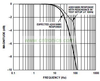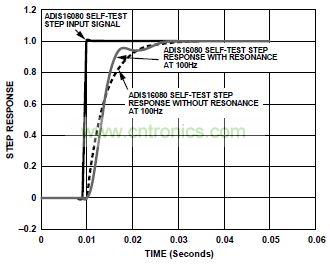 確定傳感器步進響應對於隔離在確定帶寬特性時觀察到的諧振條件很有用。圖1所示為一種采用ADIS16080的係統的頻率響應。圖中所示諧振頻率為100 Hz。開始時,該諧振到底是傳感器行為導致,還是係統中的機械諧振所導致,這並不清楚。幸運的是,步進響應(如自測功能所確定)可以區分這兩種效應。圖2顯示了兩種條件下的坐標曲線圖:測試設置導致的諧振和傳感器本身導致的諧振。