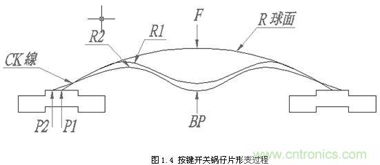 彈片自由狀態時,支撐點為P1,當外力“F”開始向下施力時,彈片開始變形及位移,此時開始產生曲線。在以P1為支撐點時,外力“F”造成彈片變形,會產生最小的R1,此時的外力“F”即為彈片的OF值。過了彈片OF值位置時,支撐點P1會開始向P2位移,隻要P1一位移,則R1又會變大,造成OF值變小,此時曲線即產生向下曲線(CK)。當達到P2時,即為P2支撐之最大R2,此時即達到彈片的BP點(最小OD點)。若此時外力“F”繼續施力,則曲線又會向上產生曲線,上述過程如圖1.4所示。