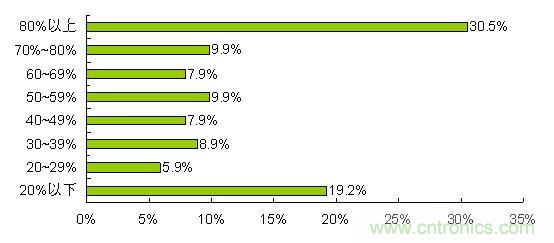 根據調查,89%的公司2011年傳感器采購總額在5千萬以下,其中采購總額在1千萬以下的占到69%。采購傳感器進口產品所占百分比呈現兩極分化,進口產品所占百分比在80%以上和20%以下的情況最多,有30.5%的整機製造商傳感器進口產品達到80%以上,19.5%的公司進口產品在20%以下。