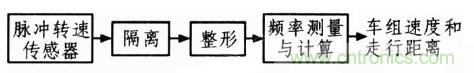 congshangshikezhi,celiangliechesudujiushijianceliechechelunzhuansuheliechelunjing。maichongzhuansuchuanganqianzhuangzailunzhoushang,lunzhoumeizhuandongyizhou,chuanganqishuchuyidingshumudemaichong,shimaichongpinlvyulunzhouzhuansuchengzhengbi。shuchudemaichongjinggelihezhengxinghouzhijieshurujisuanjiCPU進行頻率測量,再經換算從而得出車組速度和走行距離閉。其原理框圖如圖1所示。