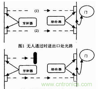 本設計的改進之處是設計一個具有計數功能的模塊,我們可以使用對射型光電傳感器,如圖1所示在洗手間的進口處設置兩個發射源和兩個接收源,當有人進或者出洗手問的門時,會阻擋光線,如圖2所(suo)示(shi),接(jie)收(shou)處(chu)就(jiu)接(jie)收(shou)不(bu)到(dao)設(she)置(zhi)光(guang)源(yuan)發(fa)出(chu)的(de)光(guang)信(xin)號(hao),這(zhe)時(shi)接(jie)收(shou)處(chu)的(de)輸(shu)出(chu)端(duan)會(hui)發(fa)出(chu)一(yi)個(ge)信(xin)號(hao),計(ji)數(shu)器(qi)就(jiu)可(ke)以(yi)通(tong)過(guo)此(ci)信(xin)號(hao)進(jin)行(xing)計(ji)數(shu)。隻(zhi)要(yao)計(ji)數(shu)器(qi)裏(li)存(cun)儲(chu)數(shu)等(deng)於(yu)一(yi)時(shi),係(xi)統(tong)控(kong)製(zhi)燈(deng)亮(liang),大(da)於(yu)零(ling)時(shi),該(gai)係(xi)統(tong)就(jiu)會(hui)控(kong)製(zhi)燈(deng)一(yi)直(zhi)亮(liang)著(zhe),一(yi)旦(dan)為(wei)零(ling),係(xi)統(tong)會(hui)控(kong)製(zhi)燈(deng)延(yan)時(shi)一(yi)小(xiao)段(duan)時(shi)間(jian)後(hou)自(zi)動(dong)熄(xi)滅(mie)。由(you)於(yu)整(zheng)個(ge)係(xi)統(tong)初(chu)啟(qi)動(dong)時(shi)無(wu)法(fa)判(pan)斷(duan)室(shi)內(nei)是(shi)否(fou)有(you)人(ren),因(yin)而(er)我(wo)們(men)還(hai)會(hui)設(she)置(zhi)一(yi)個(ge)簡(jian)易(yi)開(kai)關(guan),供(gong)使(shi)用(yong)者(zhe)進(jin)行(xing)手(shou)控(kong),且(qie)為(wei)方(fang)便(bian)使(shi)用(yong)者(zhe)能(neng)在(zai)夜(ye)間(jian)看(kan)到(dao)開(kai)關(guan)的(de)位(wei)置(zhi),我(wo)們(men)可(ke)以(yi)采(cai)用(yong)表(biao)麵(mian)具(ju)有(you)夜(ye)光(guang)性(xing)能(neng)的(de)材(cai)料(liao)來(lai)做(zuo)按(an)鍵(jian)。光(guang)電(dian)檢(jian)測(ce)係(xi)統(tong)的(de)啟(qi)動(dong)由(you)光(guang)敏(min)傳(chuan)感(gan)器(qi)控(kong)製(zhi)。