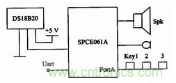 綜上所述,整體硬件電路組成如圖1所示,由SCPE061A單(dan)片(pian)機(ji)實(shi)現(xian)係(xi)統(tong)整(zheng)體(ti)控(kong)製(zhi)並(bing)實(shi)現(xian)語(yu)音(yin)或(huo)鍵(jian)盤(pan)編(bian)程(cheng)與(yu)語(yu)音(yin)播(bo)報(bao),係(xi)統(tong)可(ke)通(tong)過(guo)通(tong)用(yong)異(yi)步(bu)串(chuan)行(xing)接(jie)口(kou)實(shi)現(xian)聯(lian)網(wang)功(gong)能(neng),在(zai)不(bu)需(xu)要(yao)聯(lian)網(wang)的(de)場(chang)合(he),溫(wen)度(du)計(ji)也(ye)可(ke)以(yi)單(dan)獨(du)使(shi)用(yong),實(shi)現(xian)了(le)係(xi)統(tong)的(de)可(ke)裁(cai)剪(jian),DSl8B20用來實現溫度檢測。