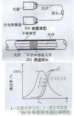 位圖2(a)為半導體吸光型(傳光型)光纖溫度傳感器示意圖。將一根切斷的光導纖維裝在細鋼管內,光纖兩端麵間夾有一塊半導體感溫薄片(如GaAs或InP),這zhe種zhong半ban導dao體ti感gan溫wen薄bo片pian透tou射she光guang強qiang隨sui被bei測ce溫wen度du而er變bian化hua。因yin此ci,當dang光guang纖xian一yi端duan輸shu入ru一yi恒heng定ding光guang強qiang的de光guang時shi,由you於yu半ban導dao體ti感gan溫wen薄bo片pian透tou射she能neng力li隨sui溫wen度du變bian化hua,光guang纖xian另ling一yi端duan接jie收shou元yuan件jian所suo接jie受shou的de光guang強qiang也ye隨sui被bei測ce溫wen度du而er改gai變bian。於yu是shi通tong過guo測ce量liang光guang探tan測ce器qi輸shu出chu的de電dian量liang,便bian能neng遙yao測ce到dao感gan溫wen探tan頭tou2(b)處的溫度。