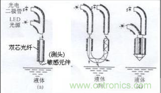 圖3(a)所(suo)示(shi)為(wei)光(guang)纖(xian)液(ye)位(wei)傳(chuan)感(gan)器(qi)的(de)基(ji)本(ben)結(jie)構(gou)。這(zhe)種(zhong)傳(chuan)感(gan)器(qi)的(de)敏(min)感(gan)元(yuan)件(jian)和(he)傳(chuan)輸(shu)信(xin)號(hao)的(de)光(guang)纖(xian)均(jun)由(you)玻(bo)璃(li)纖(xian)維(wei)構(gou)成(cheng),故(gu)有(you)絕(jue)緣(yuan)性(xing)能(neng)好(hao)和(he)抗(kang)電(dian)磁(ci)噪(zao)聲(sheng)等(deng)優(you)點(dian)。