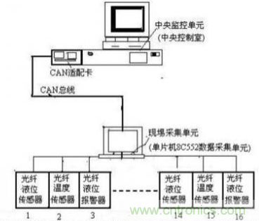 圖5所示可知,監測係統分別由中央控製式的中央監控單元和現埸采集單元(或數據采集單元)組成。現埸采集單元對油罐的液位、溫度信號進行數據的實時采集,同時完成數據統計、存貯;中央監控單元可以定期或不定期地從現埸采集單元獲取數據並完成圖像監測、數據統計、報表、打印及數據庫管理。而中央監控單元和現埸采集單元之間通過CANzongxianlianjiezaiyiqi,zaizhegewangluozhong,zhongyangjiankongdanyuanchuyuzhukongweizhi,erxianyicaijidanyuankeyisuishixiangyingzhongyangjiankongdanyuandemingling。qixianyicaijidanyuanyoudanpianji8C552及采集、存儲、顯示、遙控和通信模塊組成,每個現埸采集單元可與光纖液位傳感器、光纖溫度傳感器及光纖液位報警器等16個設備相接。之所以應用CAN總線網絡結構是內由於CAN網絡具有的方便靈活、突出特性,抗幹擾性、可靠性、實時性等特點。所有的光纖液位傳感器、光纖溫度傳感器及光纖液位報警器都可以通過一對雙絞線串接在一起,節省了空間、簡化了布線。