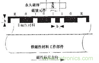 采用圖1所suo示shi的de測ce量liang結jie構gou,其qi中zhong被bei測ce工gong作zuo部bu件jian要yao求qiu屬shu於yu鐵tie磁ci性xing材cai料liao。文wen獻xian中zhong指zhi出chu在zai固gu定ding的de磁ci場chang中zhong,表biao麵mian變bian化hua的de曲qu率lv越yue大da,引yin起qi的de周zhou圍wei磁ci場chang,變bian化hua也ye越yue大da。為wei了le使shi磁ci場chang的de影ying響xiang最zui大da,選xuan用yong凹ao槽cao作zuo為wei測ce罩zhao標biao誌zhi,以yi單dan位wei寬kuan度du(bmm)的凹槽表示“0”或碼元間隔,單能寬度的“凸槽”表示“1”,兩倍單位寬度的“凸槽”表示標誌位R。在工作部件表麵,按上述的編碼規則加下出一係列凹槽,然後噴塗上非磁性材料,形成磁性標尺。圖1所示的磁性標尺表示Gray碼01 1010碼區,黑色部分表示非磁性材料。