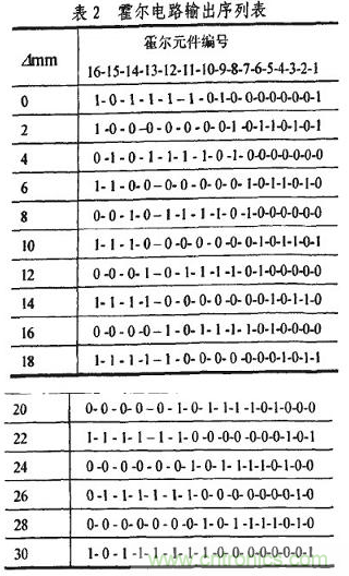 霍爾電路的工作原理是,在外磁場的作用下,當磁感應強度B超過導通工作點時,霍爾電路輸出管導通,輸出低電-半:若曰值低於釋放點時,輸出管截止,輸出高電半。因此在“凸槽”時鋼質活塞杆被磁化,磁感應強度曰增加,霍爾電路導通,輸出低電平,用“1”表示;在“凹槽”時輸出高電平,用“0”表示。以第1個霍爾元件為測量基準,從圖2所示時刻起,位移暈旃次變化b=2mm時,一個碼區行程內霍爾電路輸出的二進製序列如表2所示。分析可知,序列的標識碼為l 0000000 1,其前麵或後麵6位序列數分別為相鄰的兩個數值碼,這使它具有很強的容錯能力。標識碼每隔一個霍爾元件間距N在低位部分右移一位。值得注意的是,標識碼前麵的數值碼代表磁性標尺當前檢測位置下一個碼區的值。