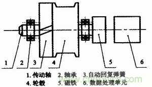 基於磁敏角度技術的拉線式位移傳感器的功能是將拉線的機械位移換成可以計量、記錄或傳送的電信號,主要由自動回複彈簧、輪轂、磁鐵以及數據處理單元等部分構成,結構如圖1所示。